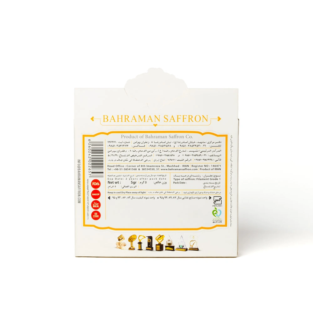 يتم تصنيع هذا المنتج من 5 جرام من خيوط الزعفران من الدرجة الأولى (نيجين). يتم تعبئة هذا النوع من الزعفران في حاويات معدنية مطعمة، وأخيراً يتم وضعه في صناديق من الورق المقوى باللون الأبيض. تتم عملية تغليف هذا النوع من الزعفران بطريقة تحمي خيوط الزعفران جيداً من العوامل الضارة كالرطوبة والتلوث وغيرها، ويعتبر هذا النوع من التغليف من أشهر وأفضل أنواع التغليف للتصدير.